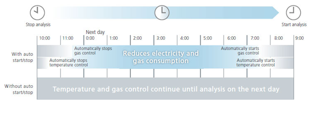 Функции автоматического запуска и автоматической остановки уменьшают эксплуатационные расходы. Функция автоматической остановки поможет экономить электроэнергию, прекращая работу термостата, когда анализ завершен. Позже, по прошествии определенного времени, прекращается подача газа-носителя и работа детектора. Функция автоматического запуска включает подачу газа через определенный промежуток времени, а затем начинает регулировать температуру.
